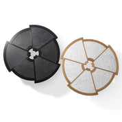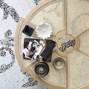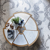 Cette spectaculaire table basse se compose de six sections aux rayons variés, fabriquées en marbre Marquiña ou en rotin, avec un bord extérieur en chêne teinté. Ses six pieds, conçus dans le même bois, soutiennent harmonieusement la structure.